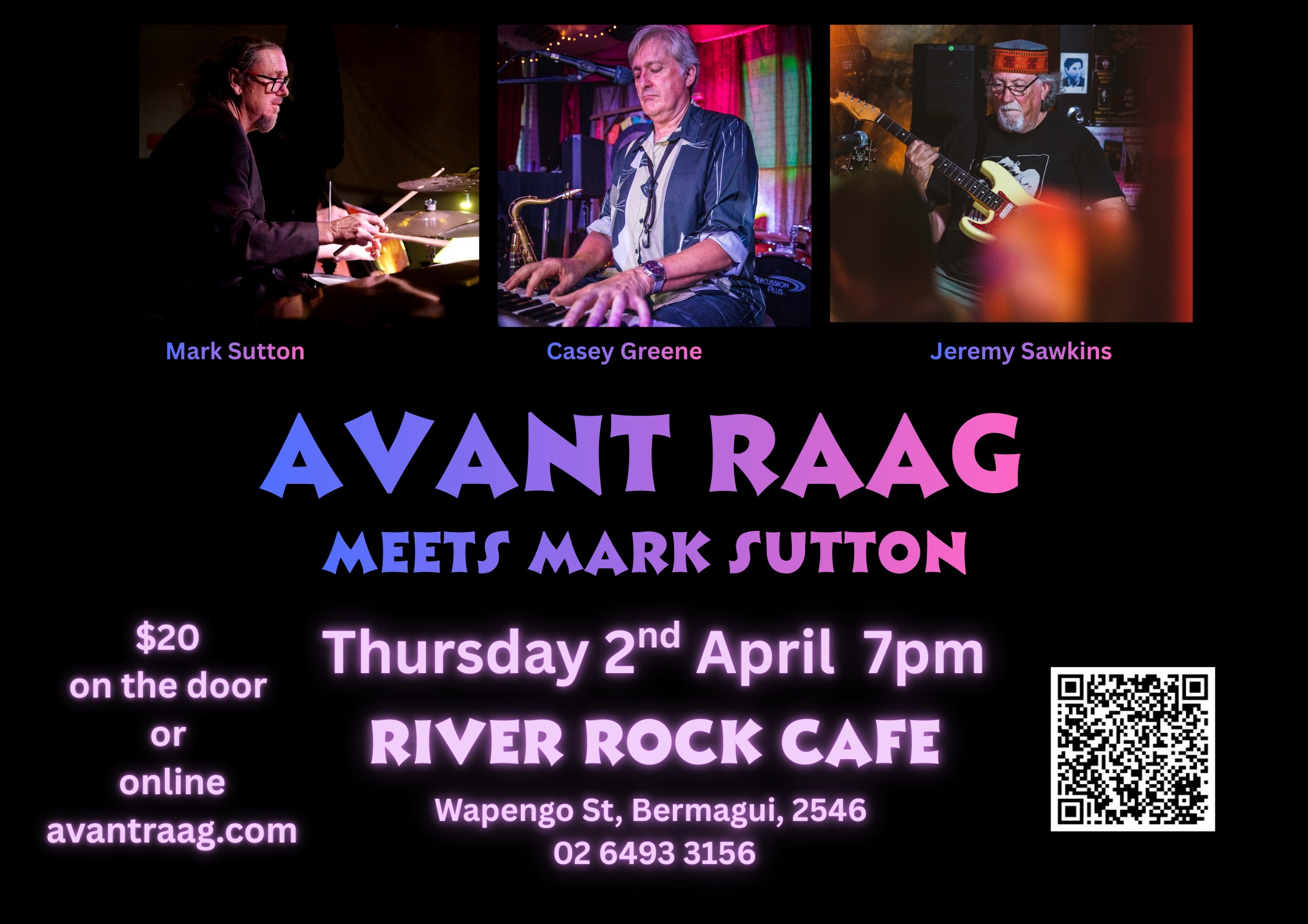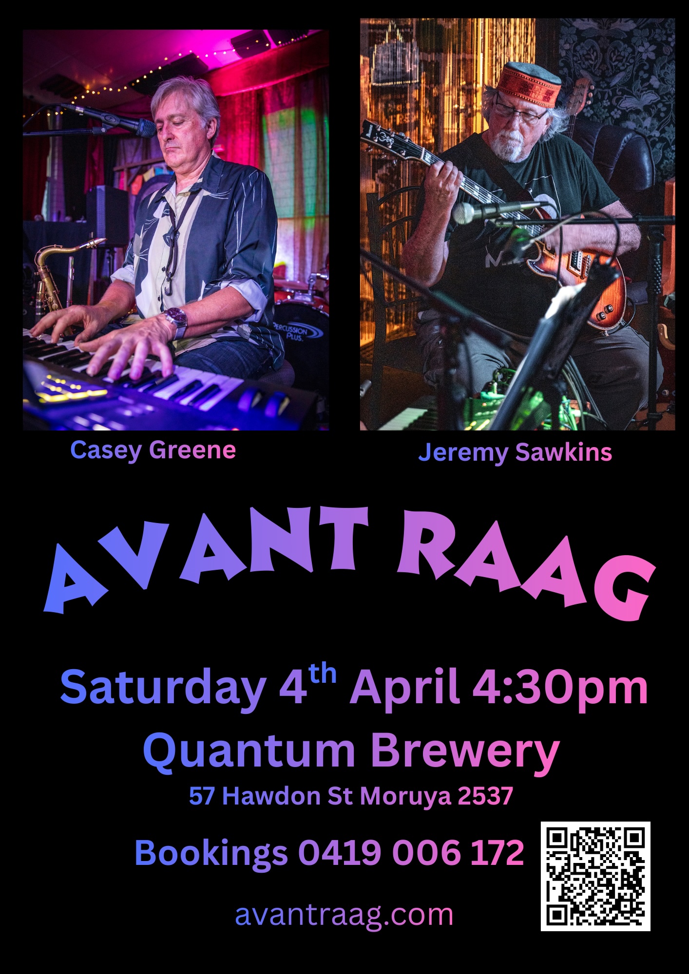 Quantum Brewery 57 Hawdon st, MoruyaExperience a boundary-pushing fusion where Jazz meets Electronica with Avant Raag. This powerhouse duo features multi-instrumentalist Casey Greene (Sax, Flute, Keys) and guitar virtuoso Jeremy Sawkins (Electric, Sitar Guitar, Bass) blending the warmth of acoustic instruments with the grit of synthesisers and effects.